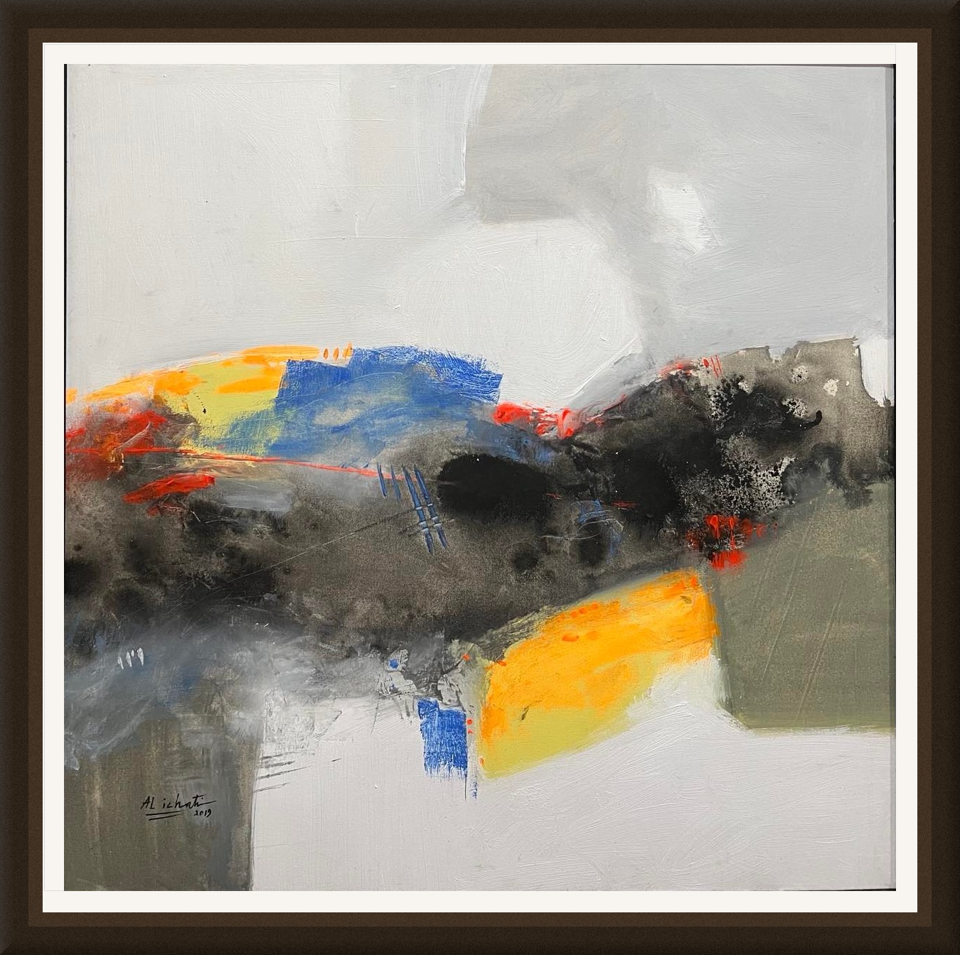Tableau Abstrait nuances de gris et éclats de couleur — Mohamed Al Ichati | 100x100cm | Artisthick